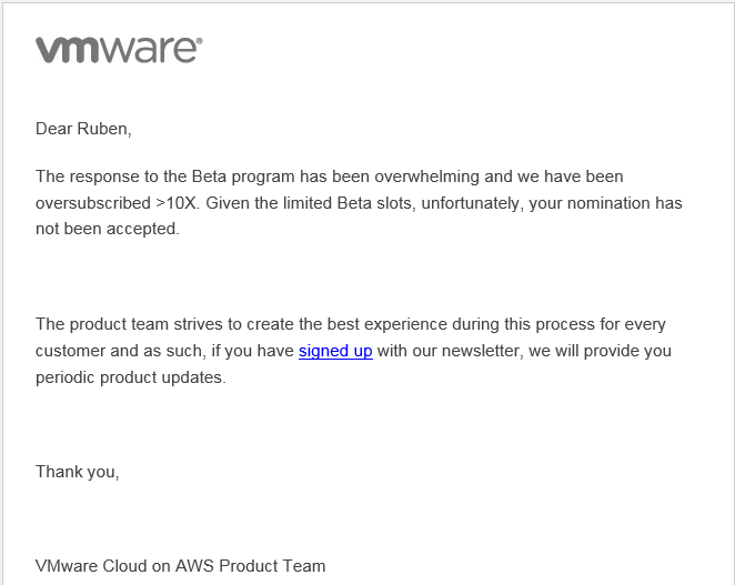No Beta version of VMware on AWS for me 27 de May de 201721 de May de 2017 by Ruben No fun for me this time!